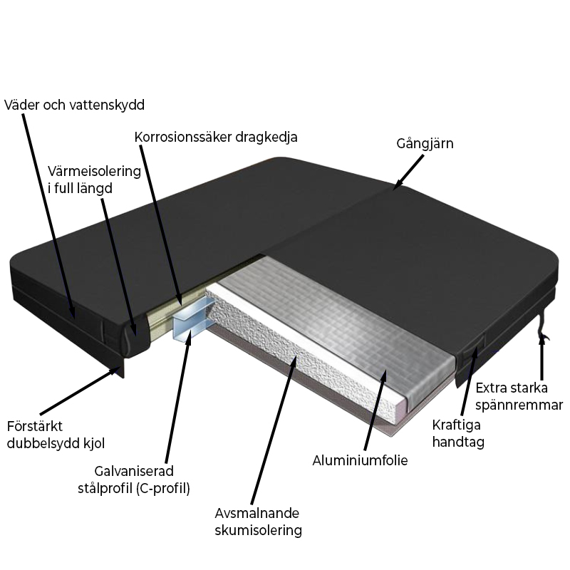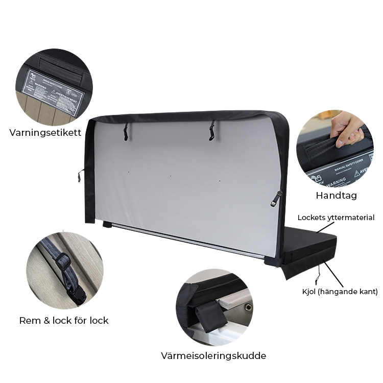 Med ett kärnmaterial av högdensitetsskum håller locket effektivt värmen kvar i spabadet. Det innebär snabbare uppvärmning, lägre energikostnader och färre temperaturförluster – perfekt för dig som vill bada ofta utan att elräkningen skjuter i höjden. - Väderbeständig och hållbar konstruktion